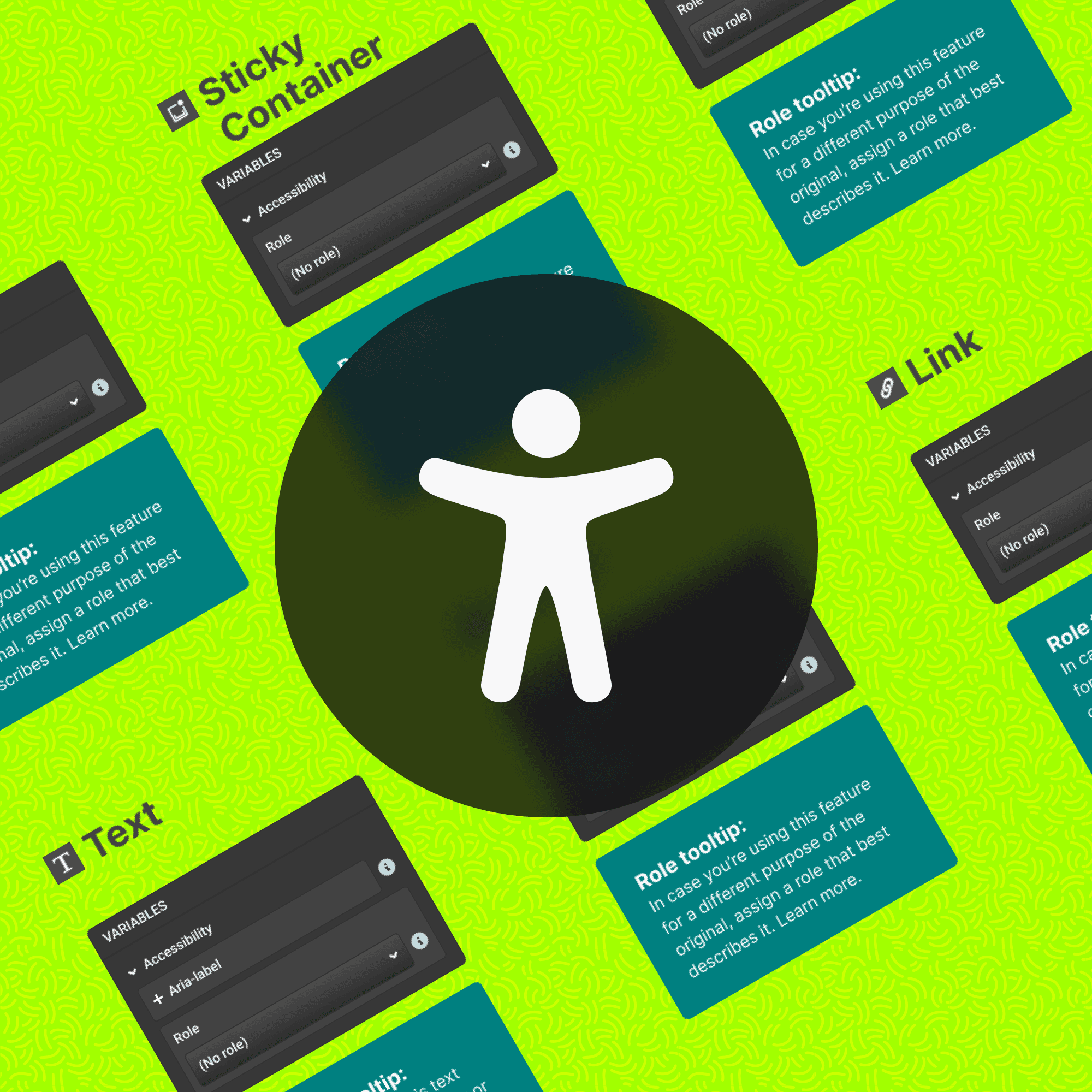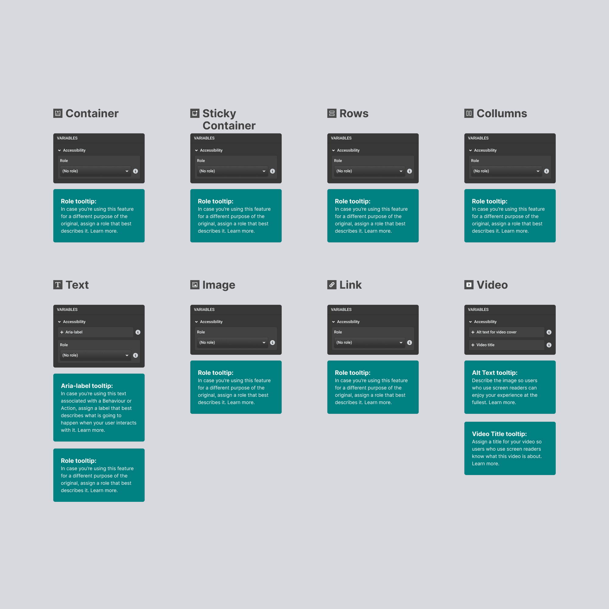 Tags, Roles, and ARIA Labels: For features with multiple uses where automatic application wasn't feasible (such as containers, sticky containers, text, images, rows, columns, links, and video), we added dropdown menus. This allowed users to manually assign appropriate tags, roles, or ARIA labels.