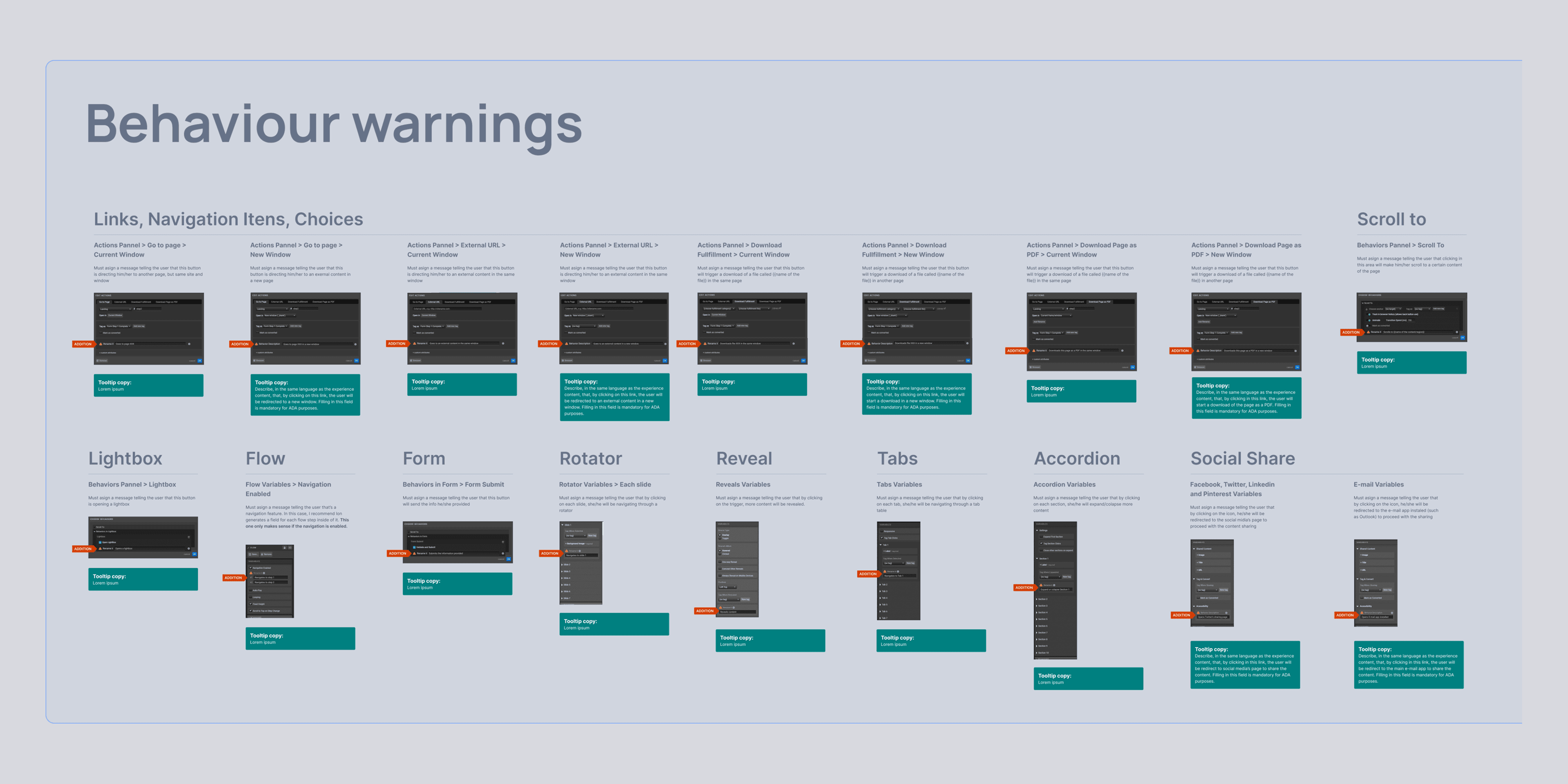 Behavior Warnings: To provide clarity for users and screen readers, we added text fields to describe the intended behavior of features that could navigate users away from the current tab. This included options like "opens in a new window," "opens in a new tab," "opens a modal," or "opens [social media] page" for social buttons.