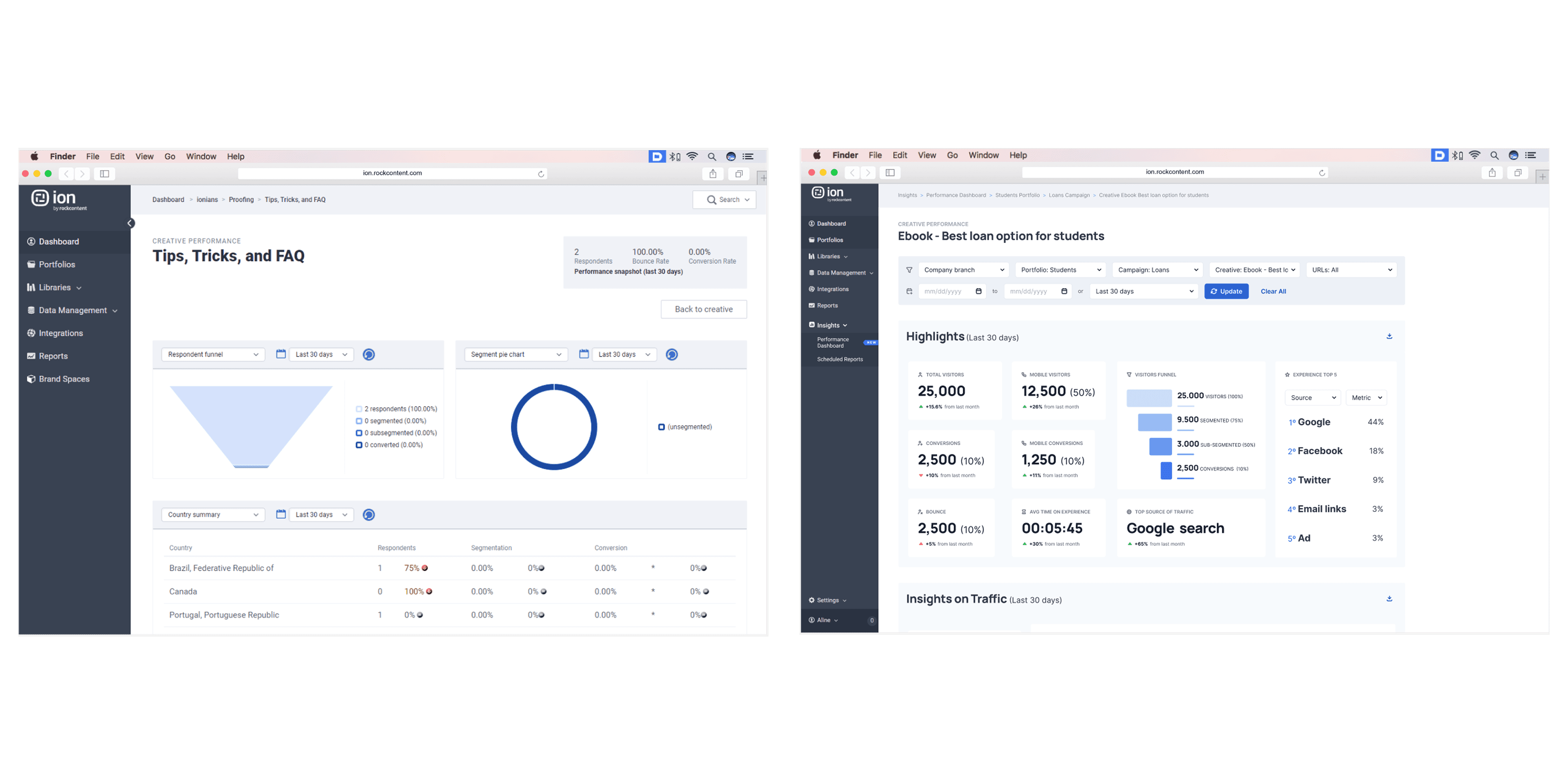 Ion is a low-code website builder focused on Conversion Rate Optimization (CRO) interfaces, enabling customers to build campaigns, generate leads, and track engagement. This project focused on redesigning the performance reporting dashboard to address significant inefficiencies for internal analysts and usability challenges for customers. The redesigned dashboard reduced the time required for analysts to generate reports from 7 business days to just 1 business day, marking an 86% improvement.